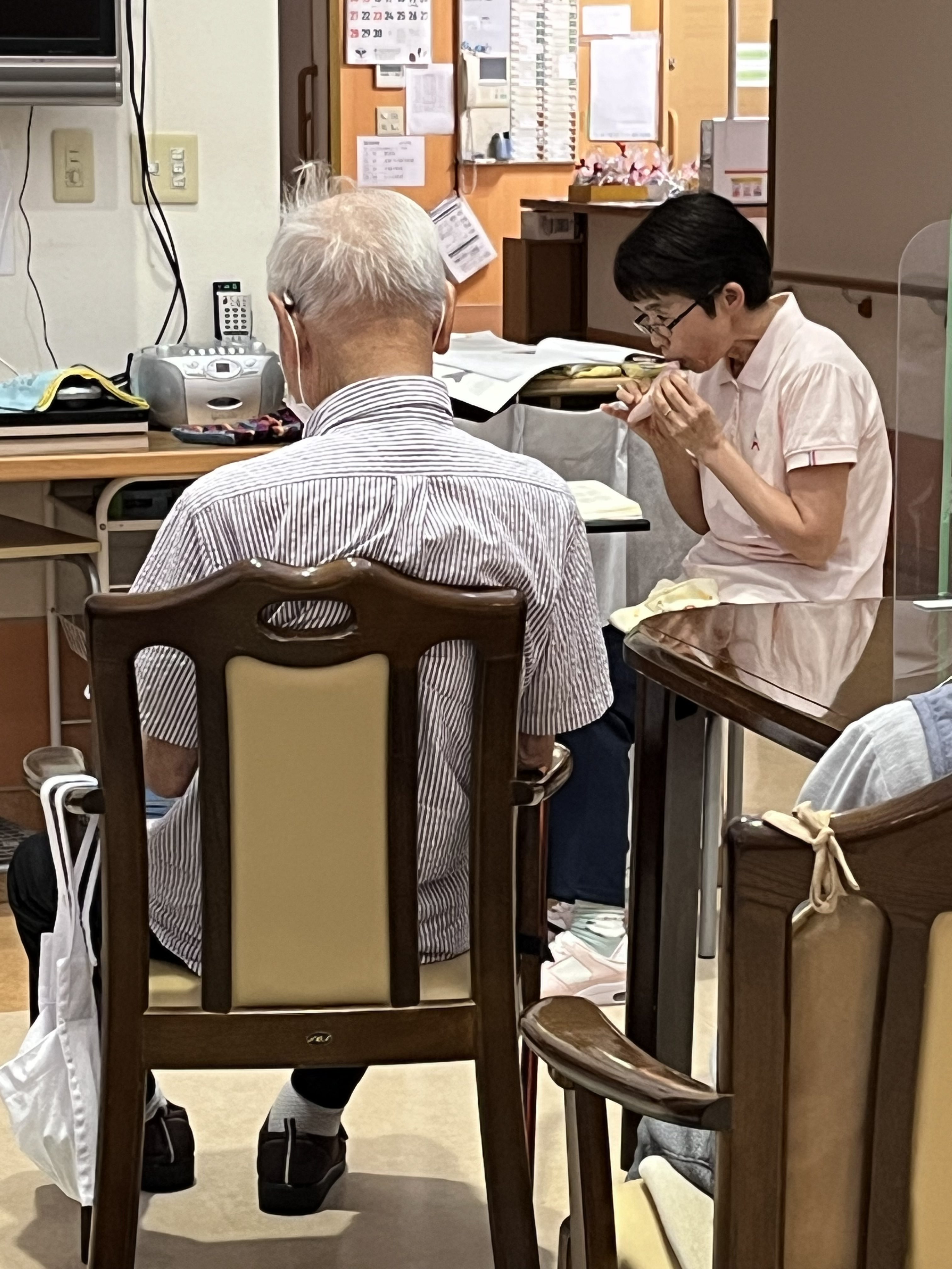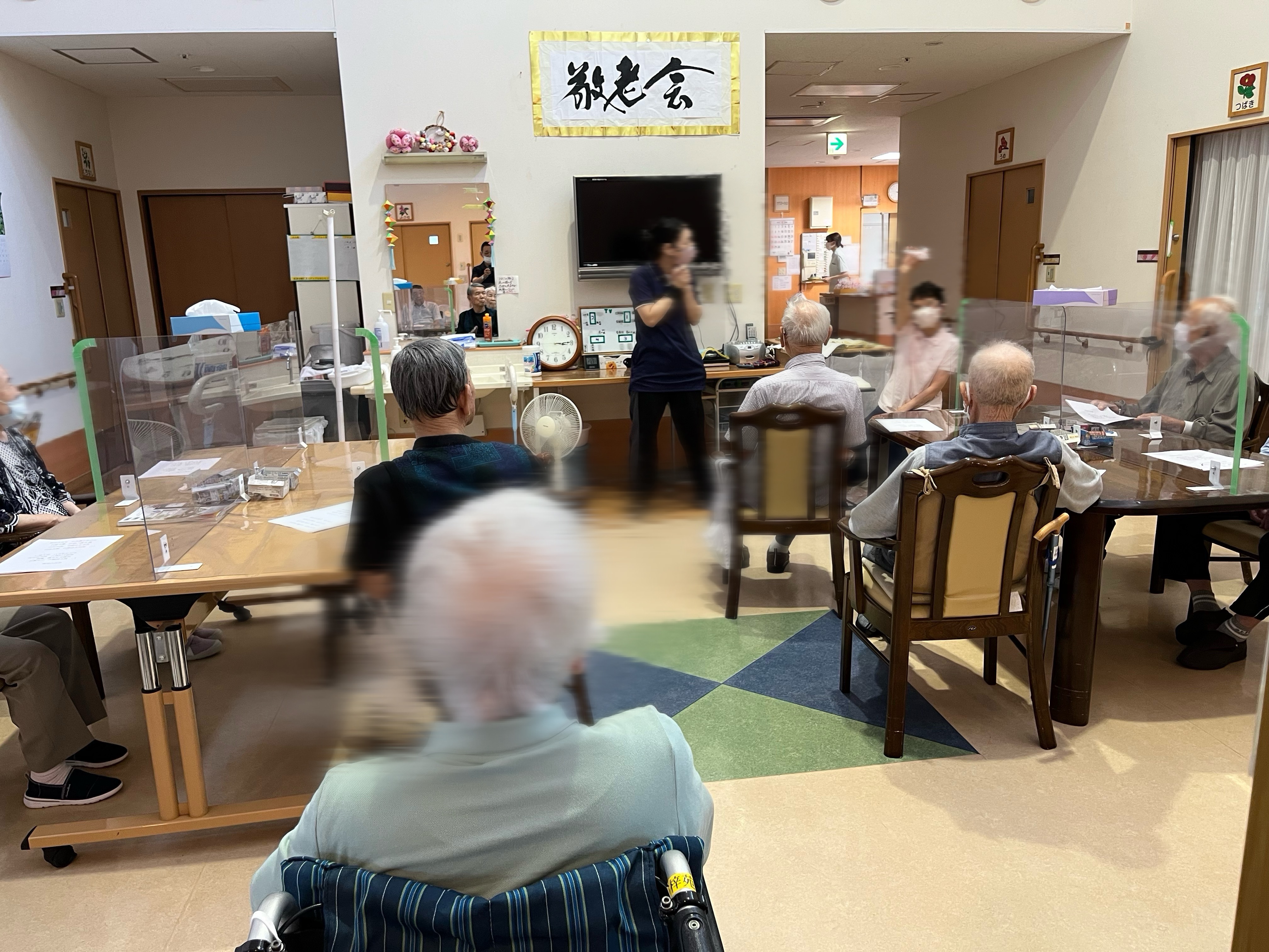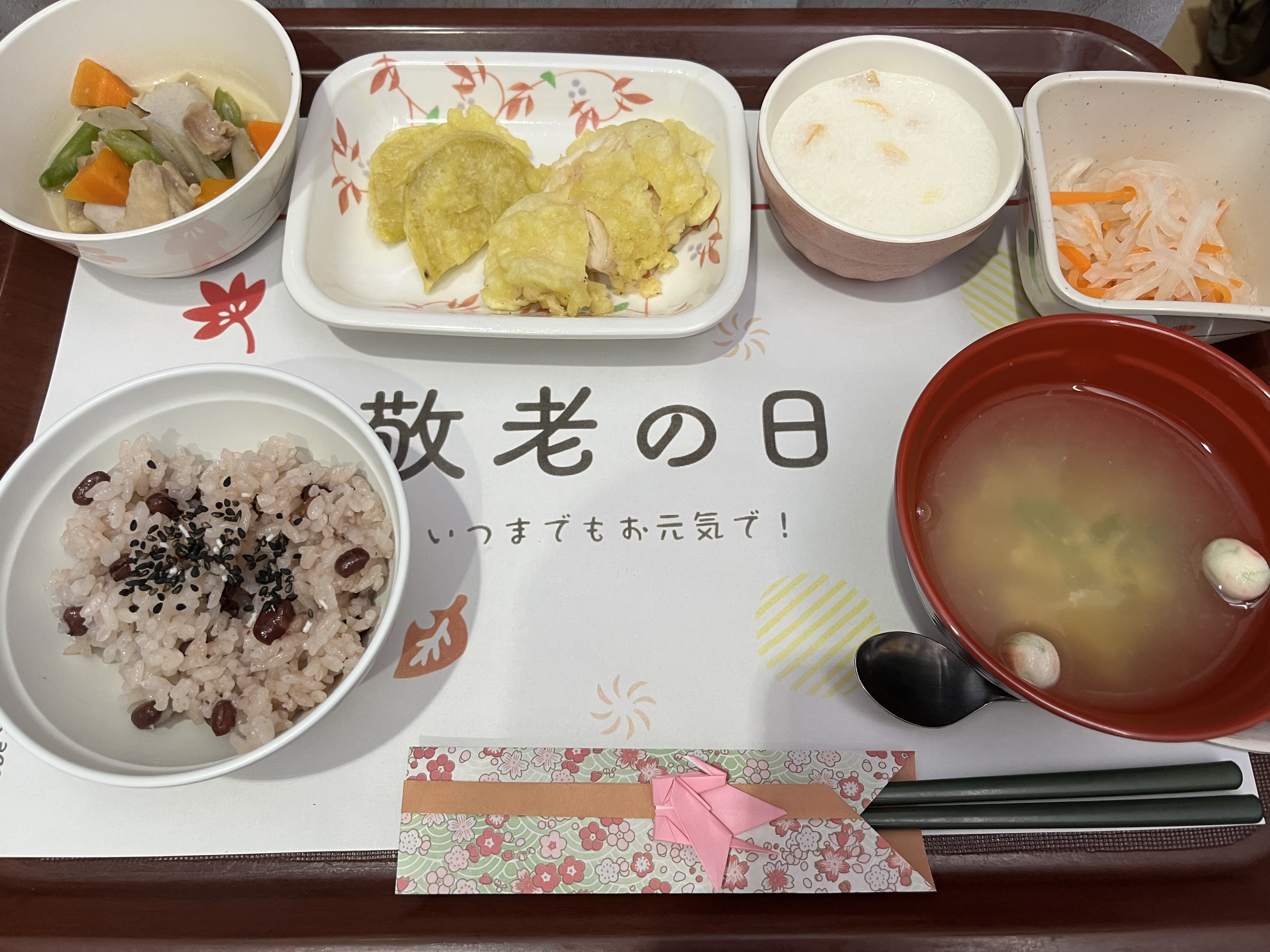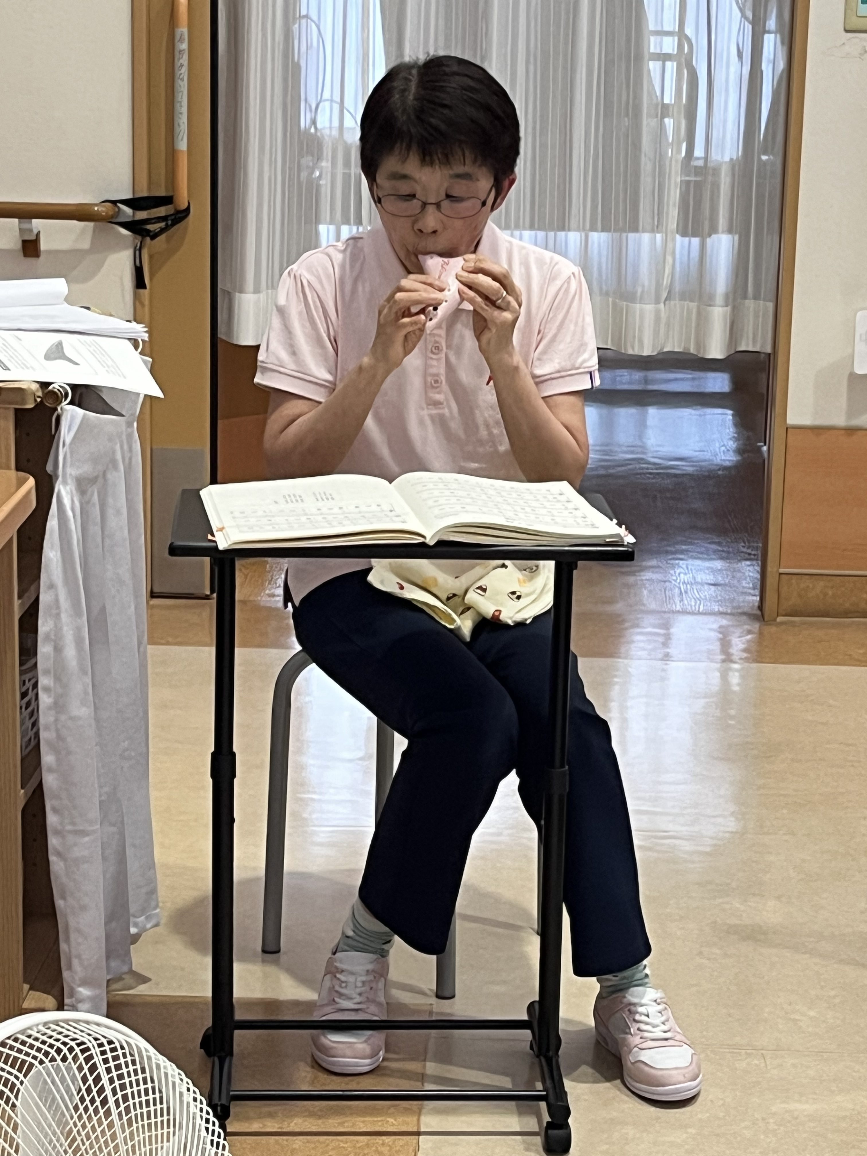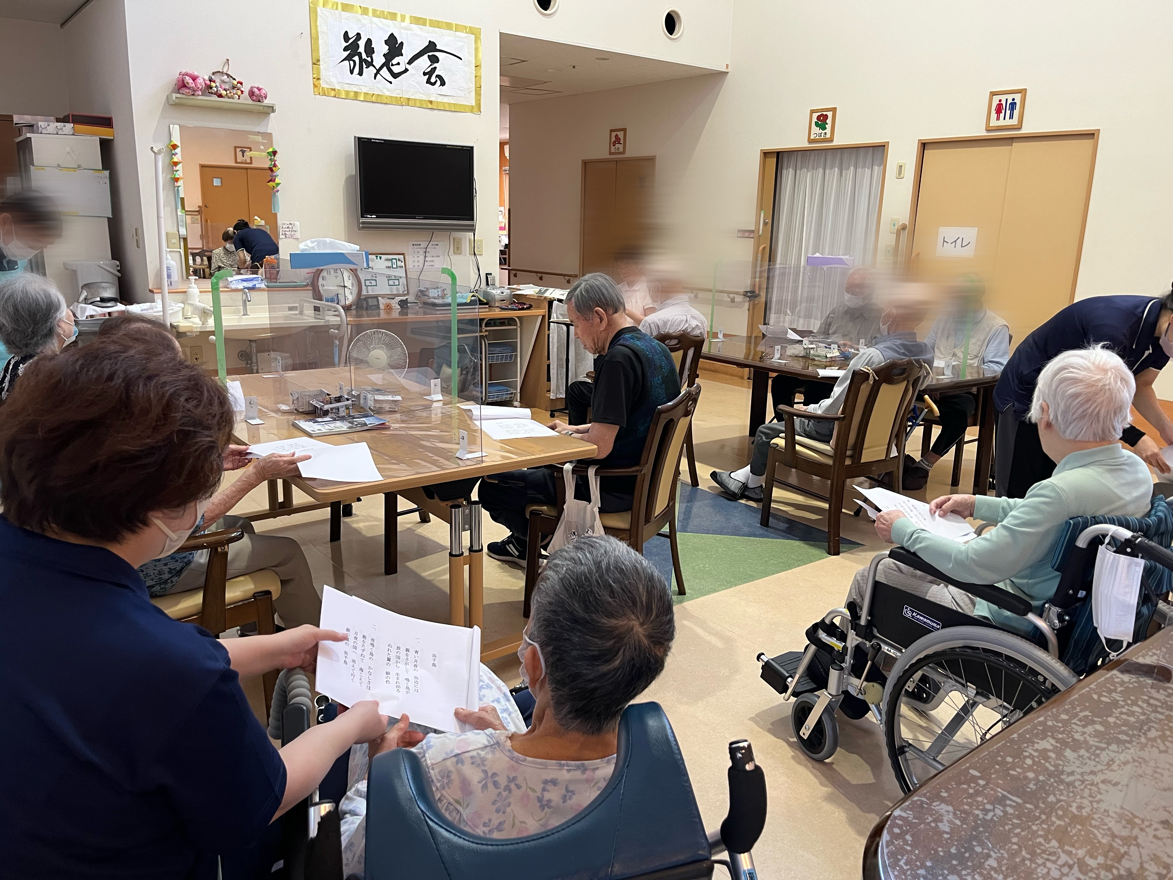 ~敬老会の様子~ 2025.9.16 敬老会を行いました。和やかな雰囲気であたたかな時間でした。 職員のオカリナの伴奏で、 見上げてごらん夜の星を・おぼろ月夜・浜千鳥などを歌いました。 敬老会お昼のメニューは 天ぷら・筑前煮・紅白なます・すまし汁・お赤飯・フルーチェでした。 皆さん美味しいと召し上がってくださいました。 ~利用者様の作品~